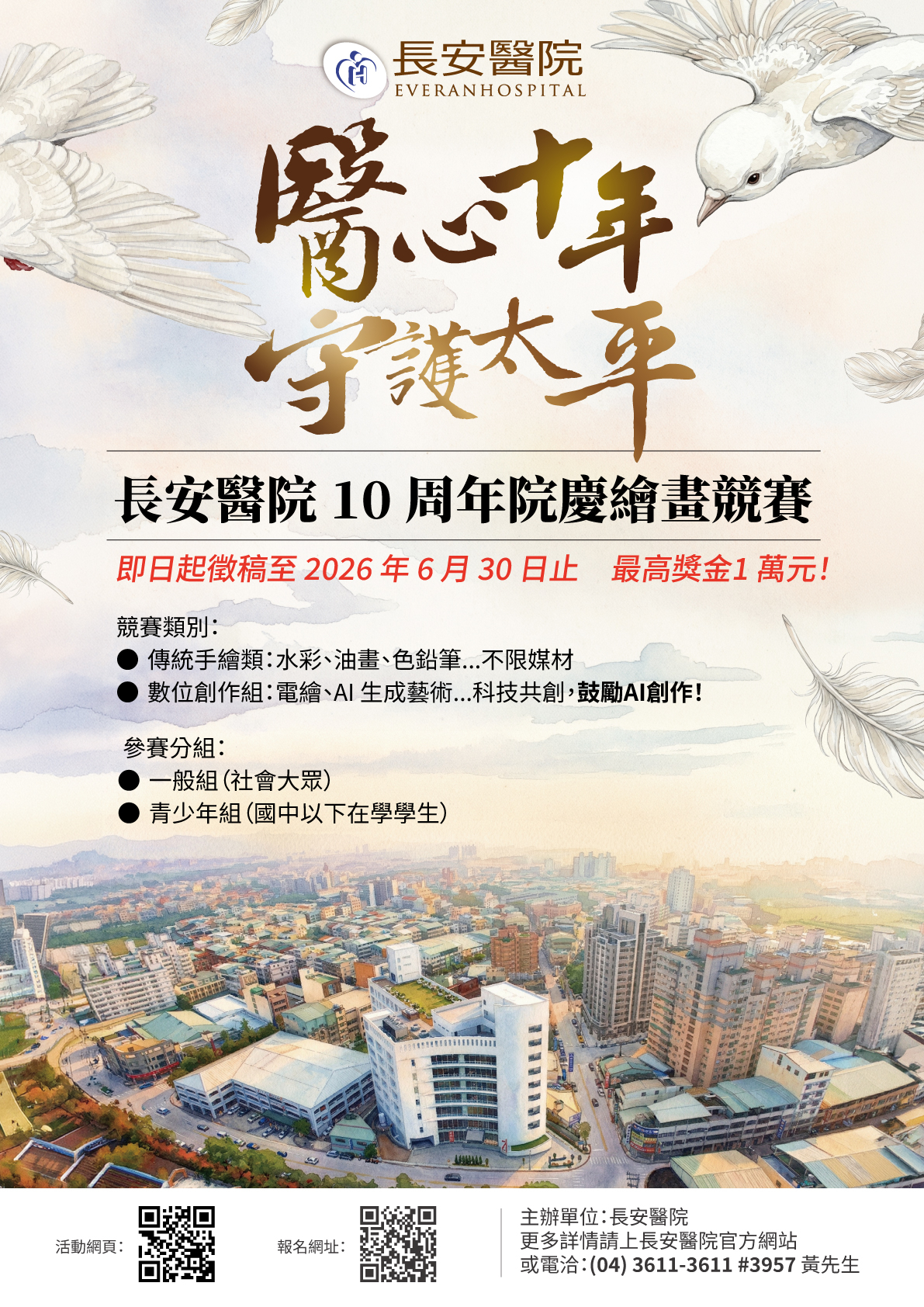 長安醫院10周年院慶繪畫競賽開跑,最高獎金 1 萬元,得獎作品還有機會在院內長期展出! |