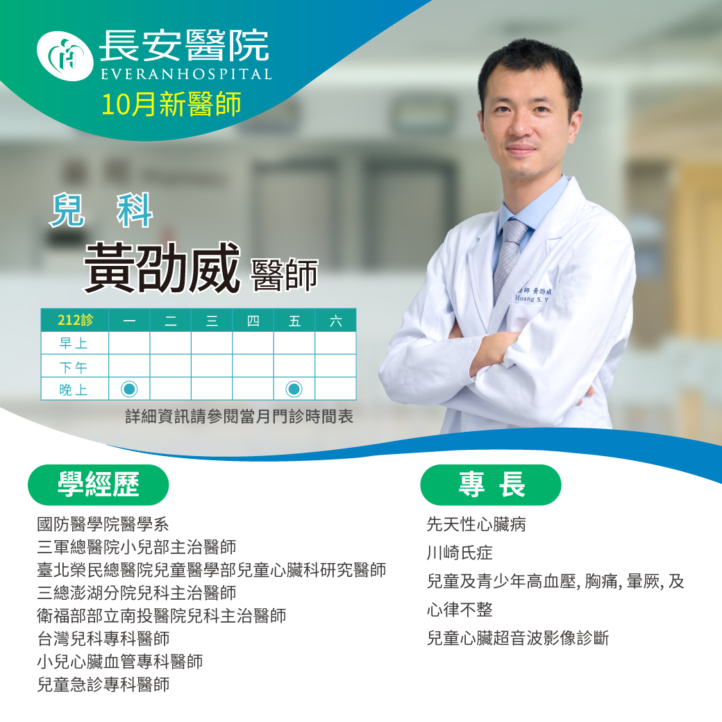 兒科黃劭威醫師10月起在本院為您服務! |